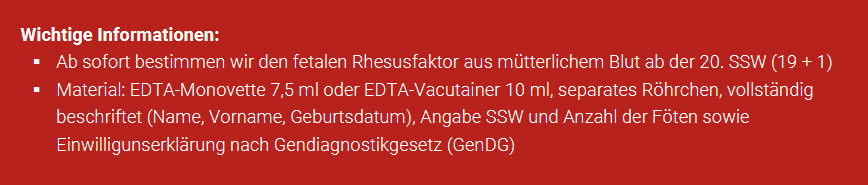 Angabe der Schwangerschaftswoche sowie Anzahl der Föten erforderlich (Leistung der gesetzlichen Krankenversicherung nur bei Einlingsschwangerschaft der RhD-neg. Schwangeren)